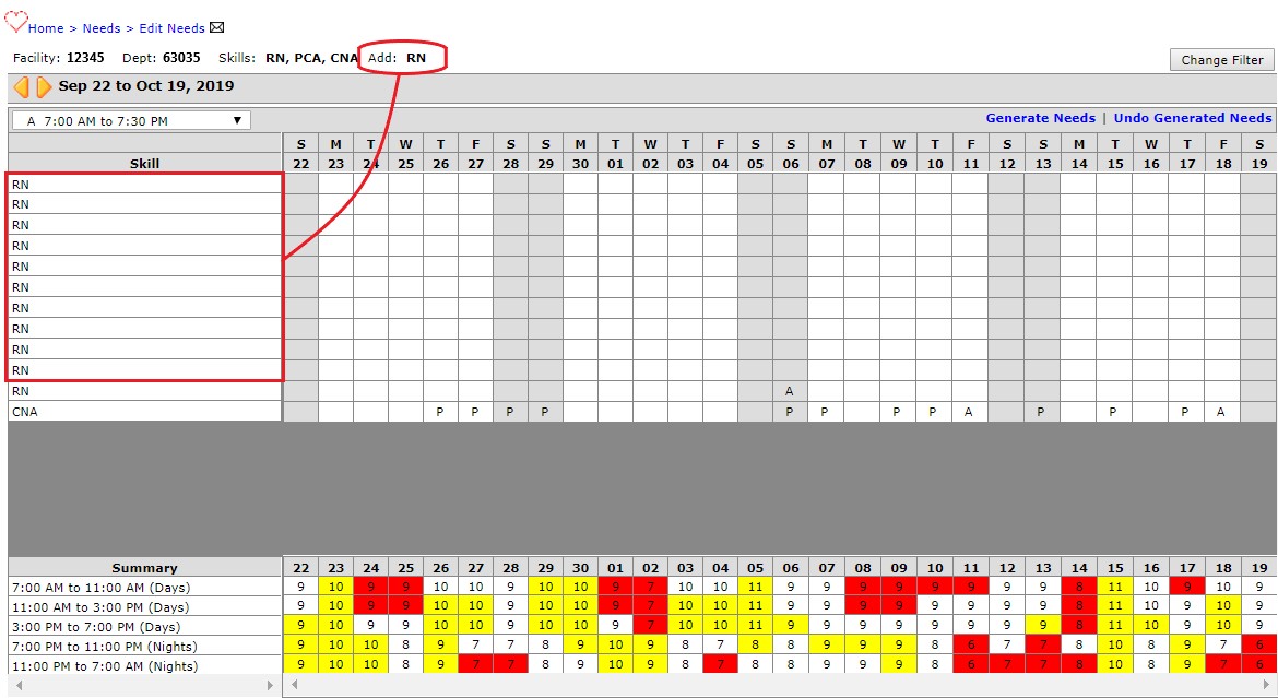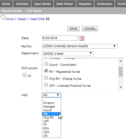 - On the Need Filter page, select the Date, Facility, and Department in which you will add