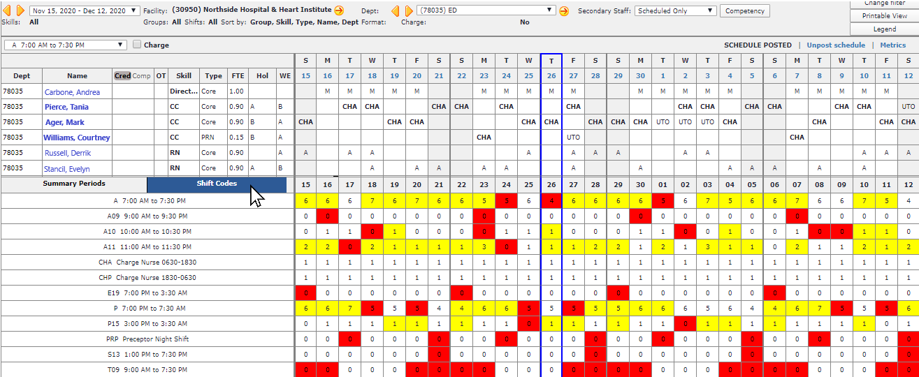Department Schedule Displaying the Staffing Summary by Shift Codes