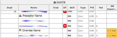 On the department schedule screen, preceptors and orientees are designated by the icons displayed next to their names. Click the Match button to view details about preceptor and orientee matches.