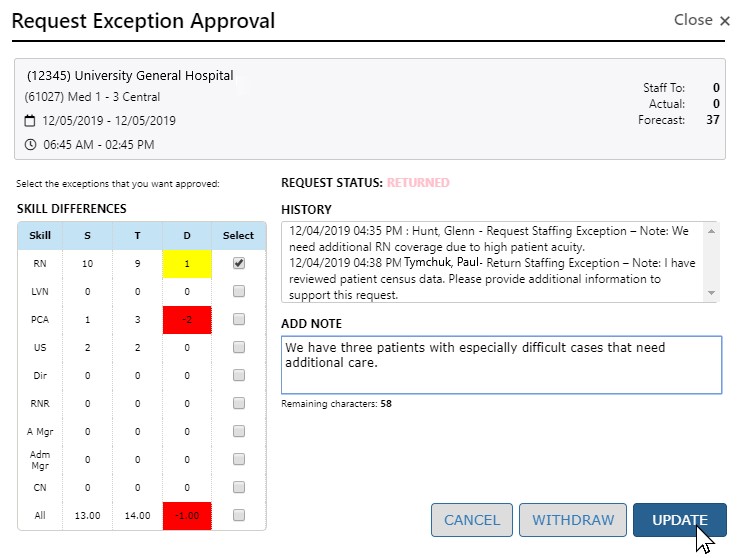 At times, patient census or staffing levels may change and a staffing exception is no longer warranted. In these cases you may choose to withdraw your exception request.