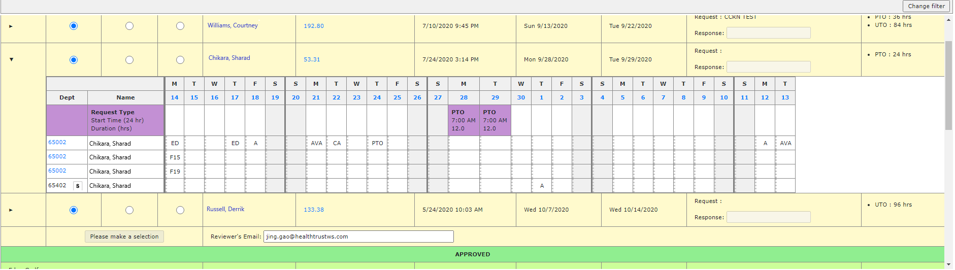 - Click Change Filter to sort requests by date range, department, skills, shifts etc.