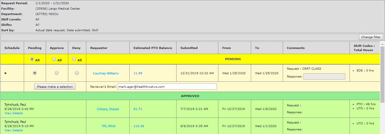 Access: If you are an Administrator, House Supervisor, Manager, or Director, with supervisory oversight of an employee, you may approve or deny submitted requests depending