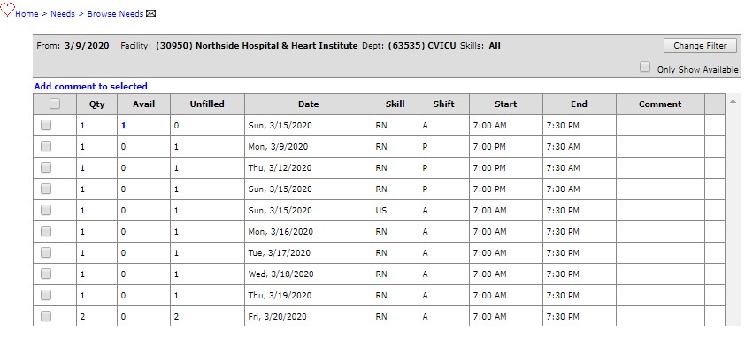 The Manager's Browse Needs view differs from the employee view. Employees CANNOT see the number of open positions, the number of employee's who have requested to fill the need, or the number of shifts remaining to be filled.