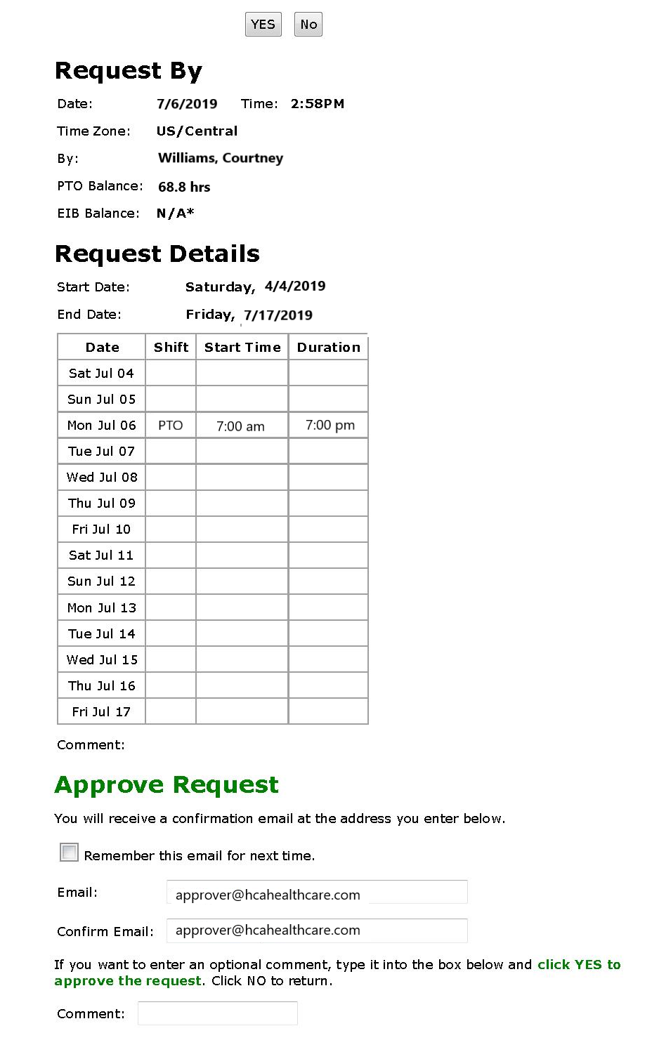 - If the request is Approved, the request moves from Pending to Approved status on the Submitted Requests screen. The requested shift codes are added to the schedule, and the employee and Approver receive e-mail