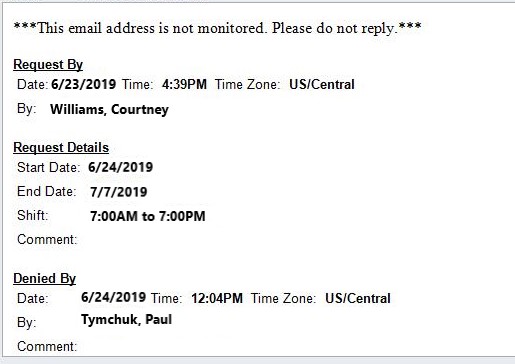 - If the request is Denied, the request moves from Pending to Denied status on the Submitted Requests screen. The employee and designated Approver